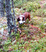 Ett av de första eftersöken vi gick, min Cocker Spaniel och jag, kan belysa vikten av att inte ha tidspress när man börjar spåra. Ett angränsande jaktlag hade skadskjutit en älgko och denna älg gick in på våra marker. Helt klart var denna älg skadskjuten då blod fanns på vägen den passerat. Vi tog oss an spåret med en jägare som följde med som skytt. Blod fanns i min axelhöjd och visade att vi följde rätt djur. Efter ca en timme kom vi fram till en bilväg där jag tyvärr var tvungen att avsluta då jag var tvungen hämta min son på fritids. En annan hundförare med en jämthund tog över spårandet. De spårade tills djuret åter gick in på angränsande jaktlags marker. Där släpptes hunden som ställde älgen men tyvärr fick inte hundföraren chans till skott på älgen. Eftersöket avslutades då mörkret föll. Vi fick tyvärr inte fortsätta eftersöket dagen efter även om jag gärna ville det då älgen inte fällts. Jag gräms fortfarande över att jag inte kunde ordna hämtning av sonen på fritids den dagen. Nu behövdes en ställande hund i detta fallet men vi hade kanske fått fortsätta spåra om jag haft tid fortsätta. Nu har jag skaffat en wachtelhund som i dagsläget är ett år. Under hösten ska han jagas in på älg. Om det visar sig att han ställer älg kommer han att släppas efter skadade älgar. Givetvis är han spårtränad och har hittills klarat av anlagsprovet i viltspår.